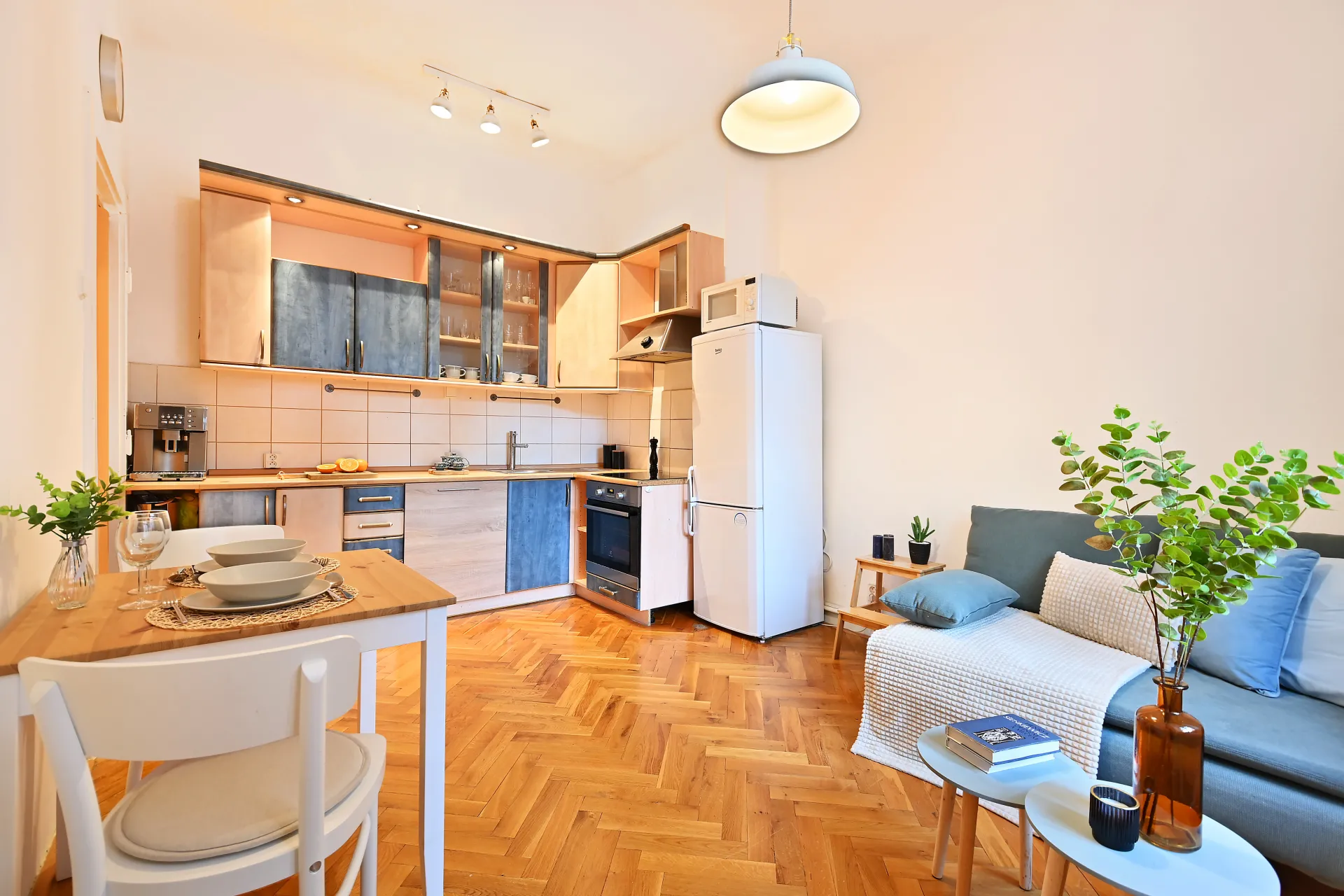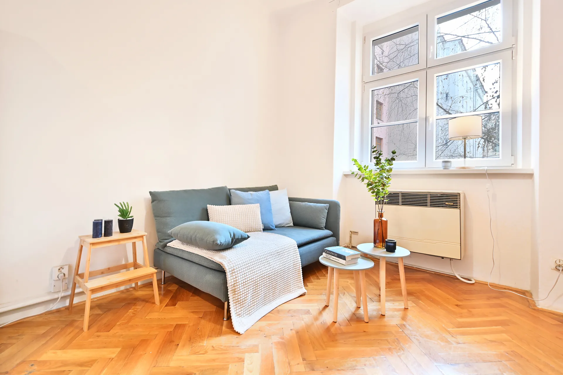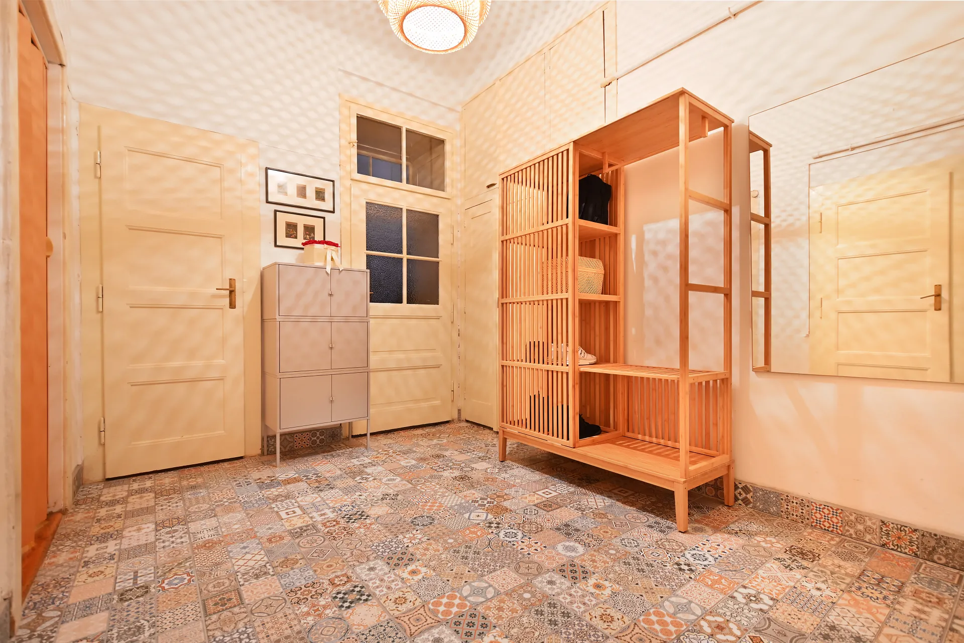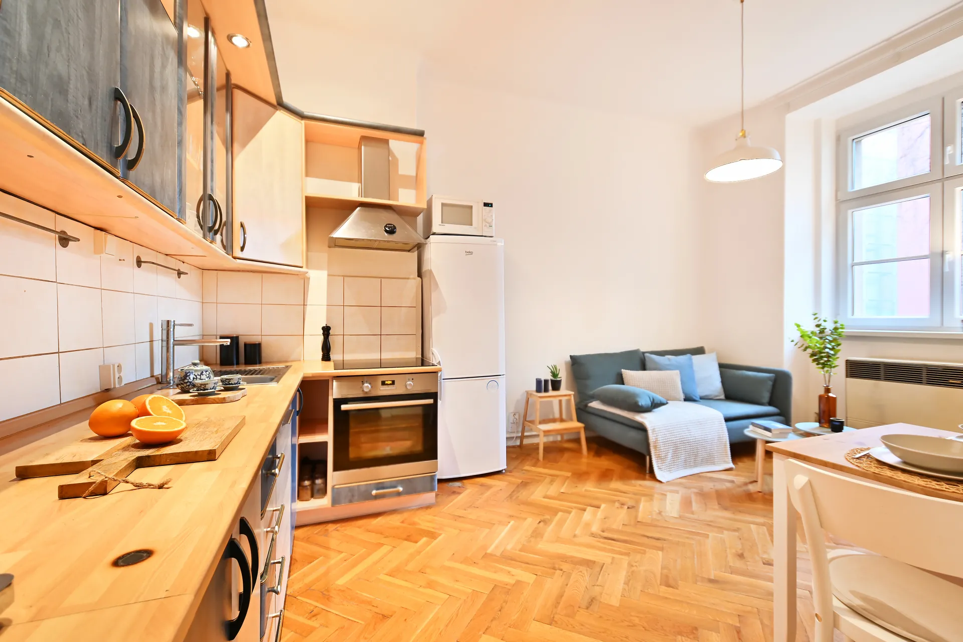 Pro zájemce o příjemné bydlení ve velmi dobře občansky vybavené části Prahy 3 – Žižkov, ulice Hájkova, nabízím exkluzivně prodej dostatečně prostorného bytu 1+1 (53m2) se sklepní kójí a možností pronájmu parkovacího stání nedaleko. Byt je situovaný v původní cihlové zástavbě klidné části Žižkova a samotný dům o pěti patrech prošel rekonstrukcí společných prostor, výměnou oken a sanací sklepů. Samotná bytová jednotka nacházející se v prvním patře (2.NP), je před rekonstrukcí, avšak v udržovaném funkčním stavu. V rámci rekonstrukce lze změnit dispozici bytu na 2+kk. Hlavní část bytu tvoří světlý obývací pokoj (23,7m2, orientace na východ) dostatečně prostorný pro případnou kuchyňskou linku (nyní prostor určený pro spaní). Na opačné straně bytu se nyní nachází oddělená kuchyň (14,6m2, orientace západ) s výhledem do klidného vnitrobloku. V centrální části bytu je vstupní hala, umožňující vstup do koupelny, na samostatnou toaletu a do praktické komory. V obytných pokojích jsou na podlaze parkety, ve vstupní hale (8,2m2) nová dlažba. K vytápění bytu se používají vafky, ohřev vody karmou. Budoucí majitel jistě ocení kompletní občanskou vybavenost a výbornou dopravní obslužnost. V okolí jsou velmi dobré restaurace a kavárny, parky, školy a školky. To vše v docházkové vzdálenosti. V případě zájmu o další informace či prohlídku mě, prosím, kontaktujte. Těším se na setkání.