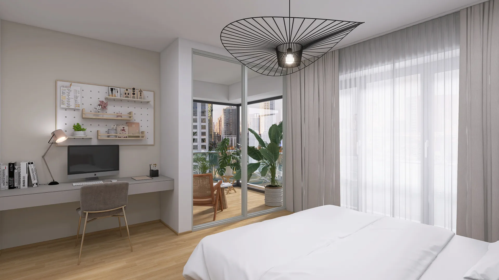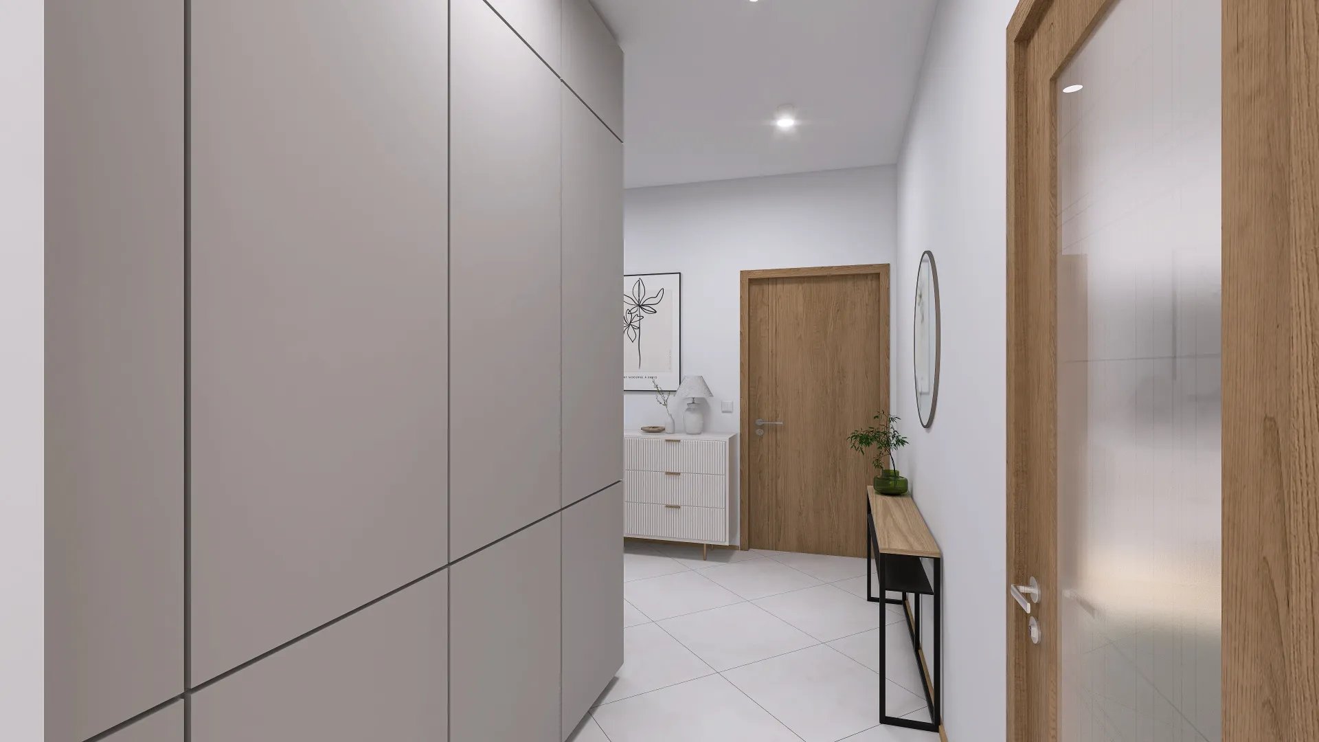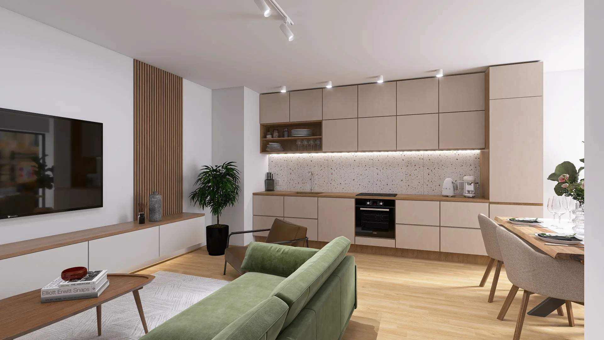 Dispozice jednotky nabízí dostatečný prostor pro obývací pokoj spojený s kuchyňským koutem (celkem 29,1m2, orientace na západní stranu). Z obývacího pokoje můžeme vstoupit na zimní zahradu (4,3m2) jež nabízí ideální místo pro realizaci milovníka květin a relaxaci. Na stejnou světovou stranu je orientována i ložnice (16,1m2), opět se vstupem do zimní zahrady. Obě místnosti pak spojuje také vstupní předsíň (10,5m2), ze které se dostaneme také do koupelny (5,6m2) osazené vanou a umyvadlem, toaleta je řešena samostatně. Praktičnost projektanta při plánované výstavbě podtrhuje existence komory pro zázemí a úklid jednotky. V suterénu domu je součástí prodeje garážové stání a sklep. Velikost celkového projektu sebou nese řadu výhod – dostatečně dimenzované výtahy, recepce budovy s možností přebírání zásilek, možnost nákupu potravin i restaurace v rámci objektu. To vše zcela jistě ocení budoucí majitel. K tomu i kompletní občanskou vybavenost a výbornou dopravní obslužnost.