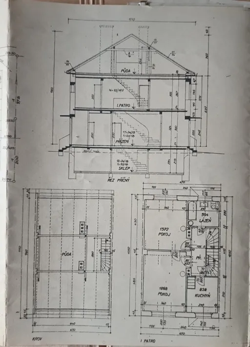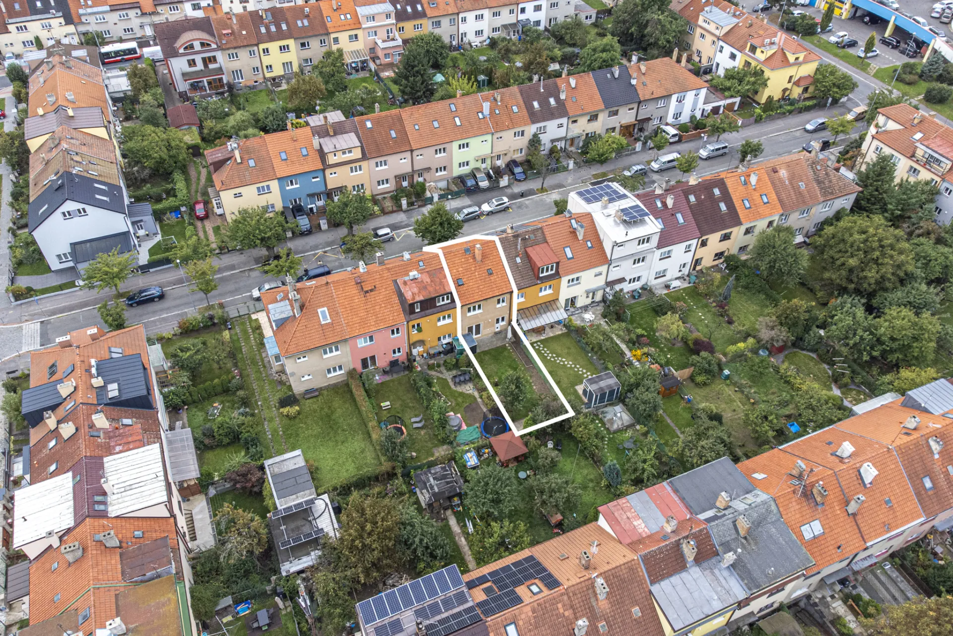 Stavba stojí na pozemku 207m2, zastavěná plocha je 70m2, na zahrádku připadá 104m2 a před domem je dalších 33m2. Dispozici domu 4+1 tvoří v přízemí prostorný obývací pokoj 33m2 s průhledem do kuchyně 9,4m2. Z obou těchto částí domu je možné vstoupit na zahradu orientovanou na sever. V druhém podlaží najdeme dvě dostatečně velké ložnice (obě 16,5m2) a další menší pokoj vhodný jako pracovna či pokoj pro hosty (9,4m2). Na tomto podlaží najdeme také koupelnu osazenou umyvadlem, sprchovým koutem a toaletou. Technické zázemí domu je pak situováno v suterénu domu, kde je instalován plynový kotel, jež zajišťuje vytápění a ohřev vody. Je zde také další toaleta a sprchový kout. Dům disponuje taktéž pochozí půdou, využívanou k ukládání sezónních věcí, nicméně i tato část se dá do budoucna využít pro bydlení, což usnadní již přivedené rozvody elektřiny, topení, vody i odpadu.