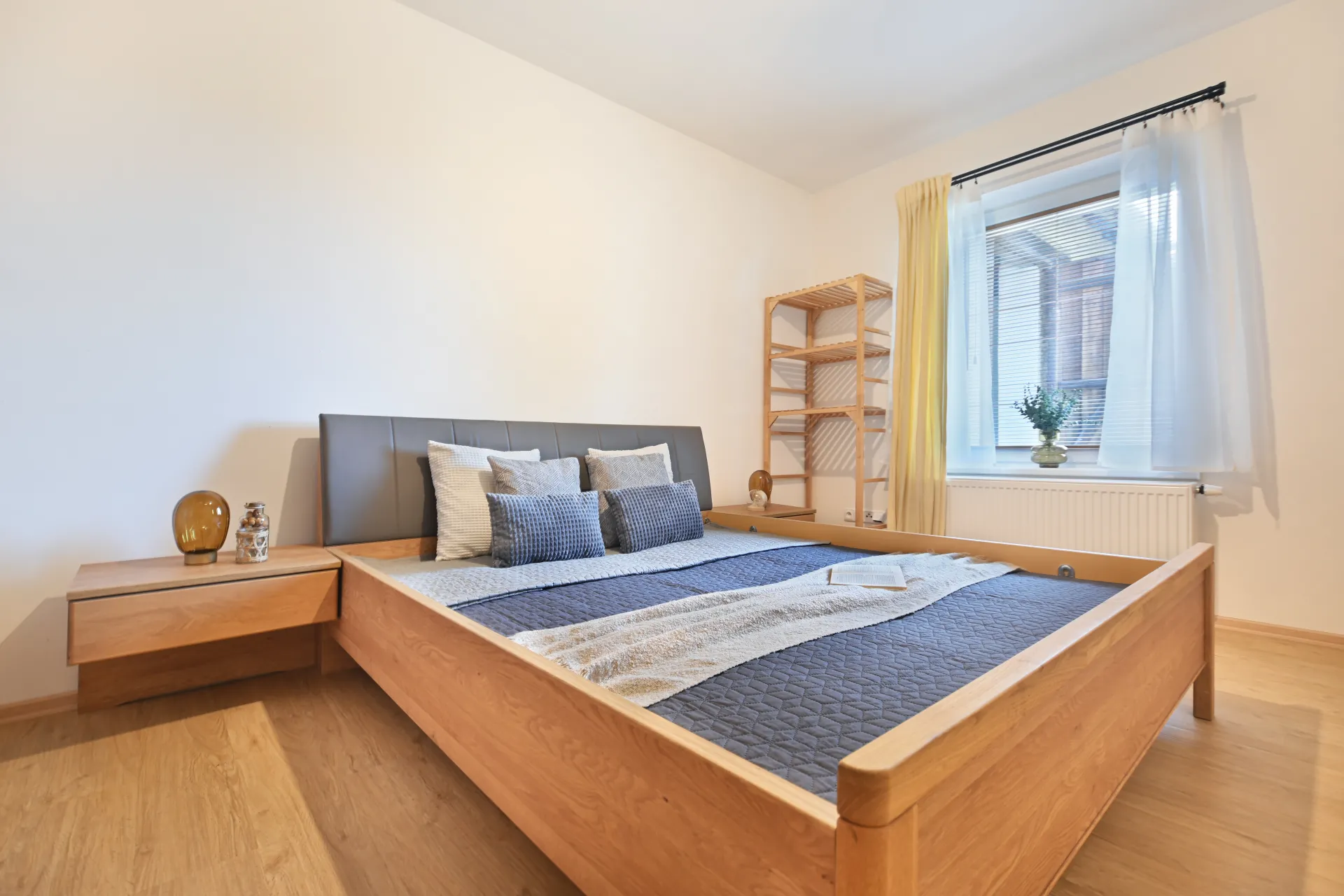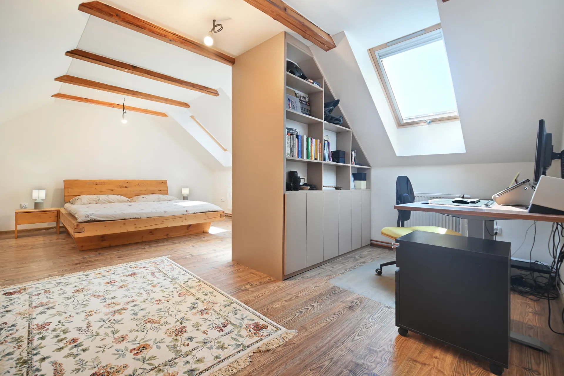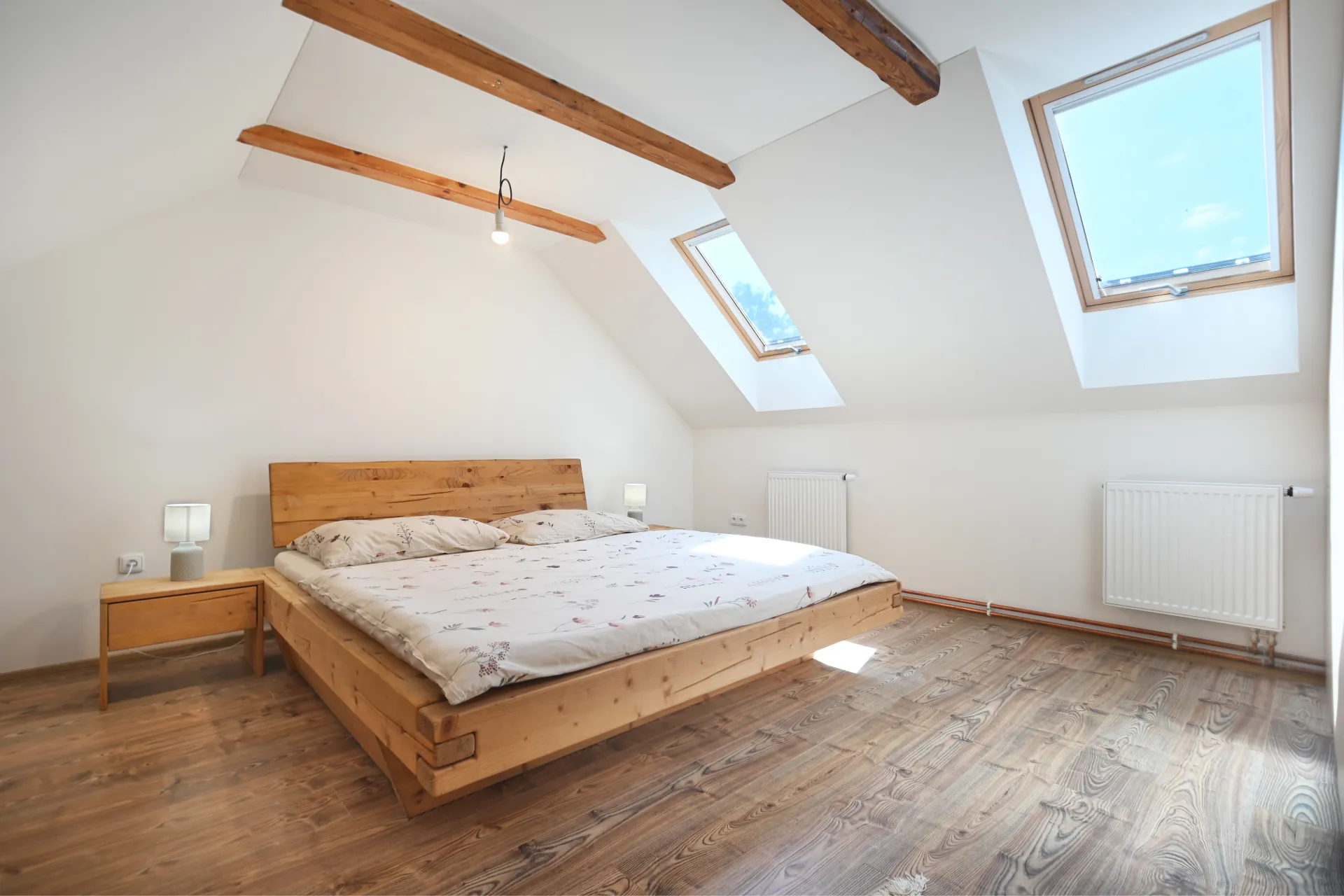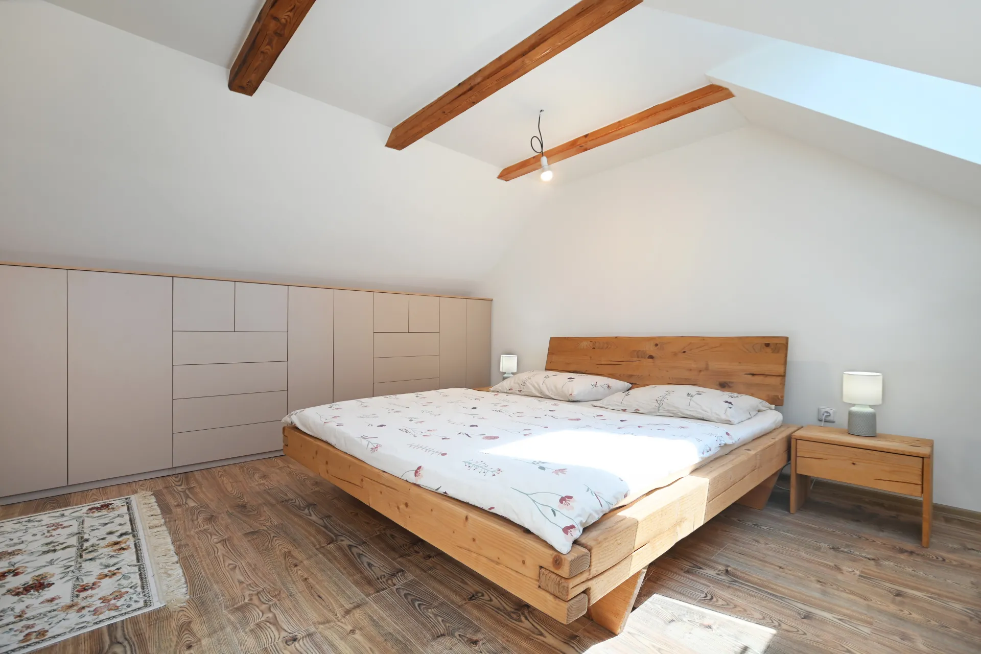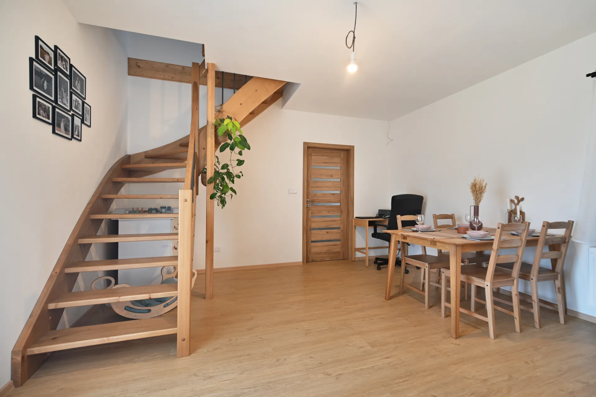 V prvním nadzemním podlaží se nachází obývací pokoj s prostorem pro vkusnou kuchyňskou linku ve tvaru U zn. Gorenje (také z roku 2022). Tato centrální část domu nabízí příjemných 41m2. Z obytné části je možno vstoupit francouzskými okny přímo na zahradu (205m2). Na stejném podlaží se nachází na obou stranách domu dva neprůchozí pokoje, s využitím jako ložnice, pracovna, případně pokoj pro hosty. Ze vstupní chodby můžeme vstoupit také do koupelny osazené jak vanou, tak sprchovým koutem, i prostorem pro pračku se sušičkou. Toaleta je řešena samostatně. Z obývacího pokoje lze vystoupat po dřevěném schodišti do druhého podlaží, kde je situována prostorná ložnice vybavená nábytkem na míru a nabízí i pracovní kout. Na protější straně podlaží je aktuálně dětský pokoj. Uprostřed podlaží je opět toaleta s umyvadlem. V těchto místnostech jsou použita kvalitní střešní okna zn. Velux.