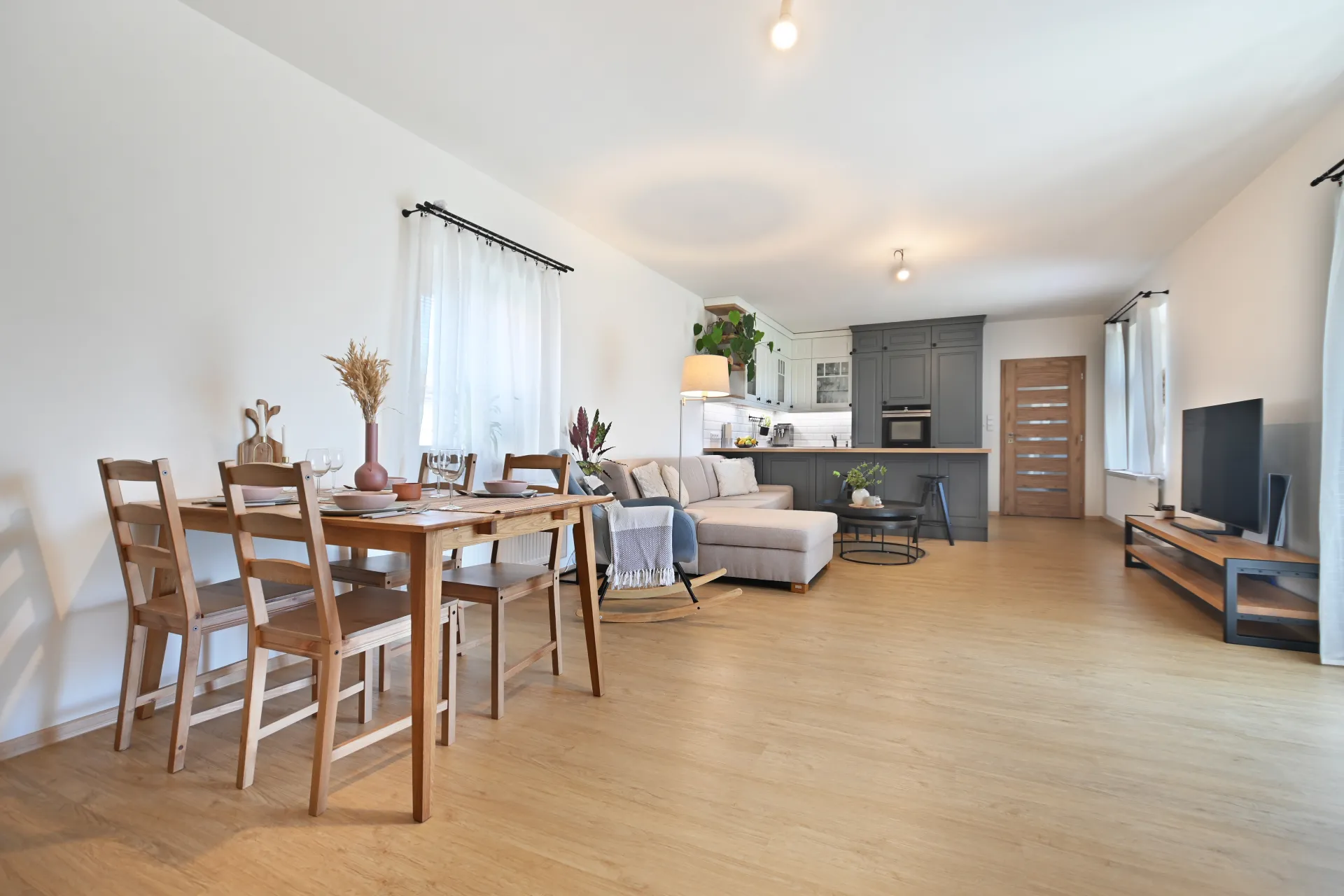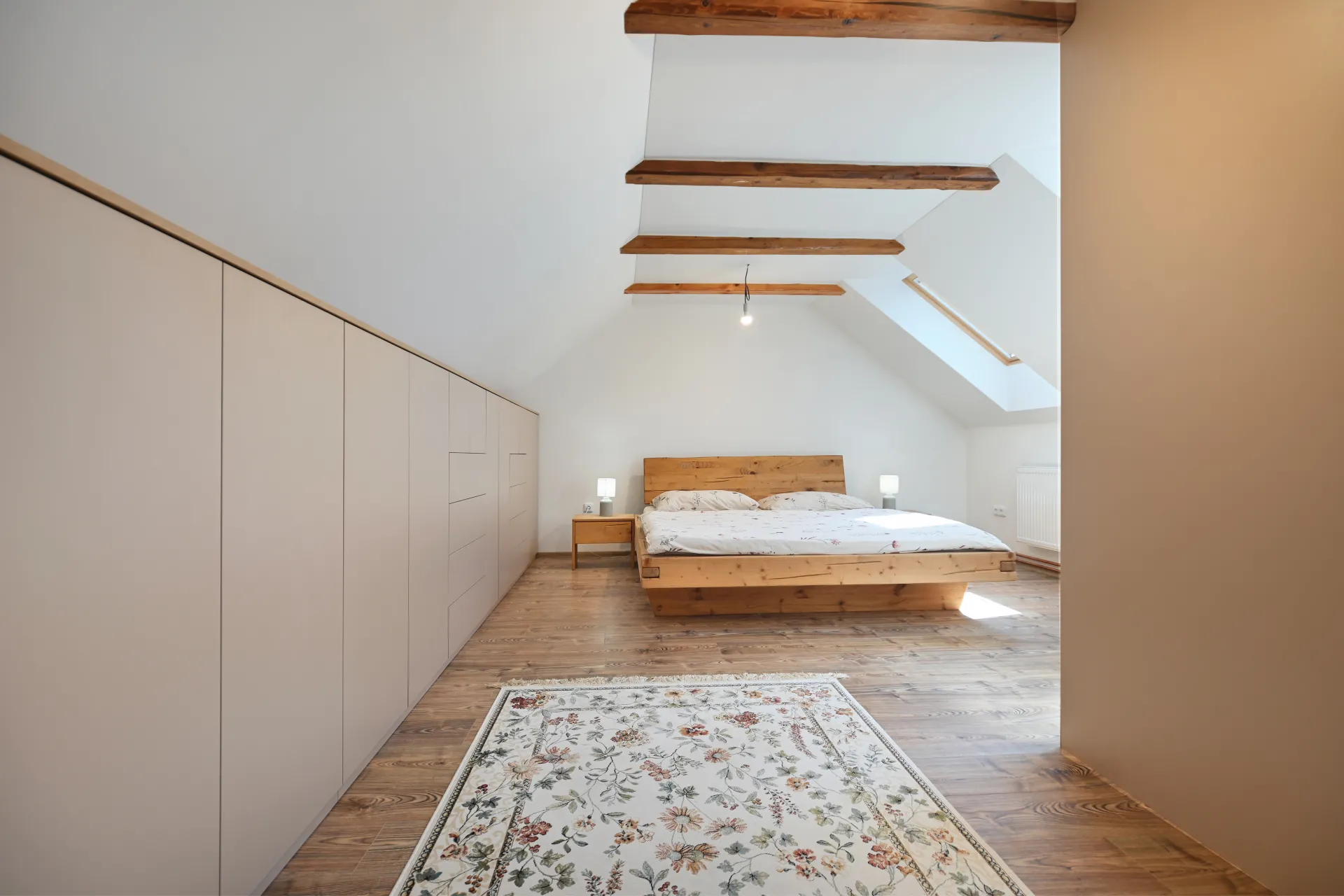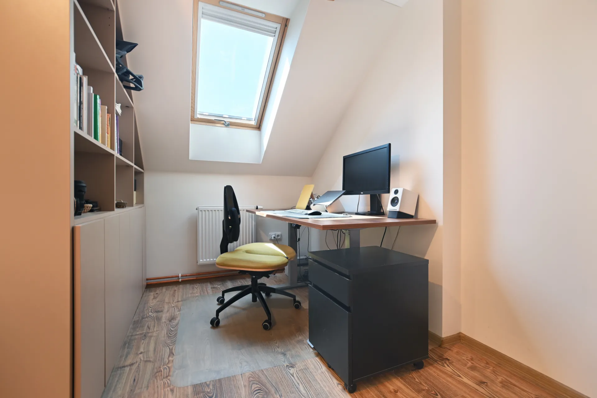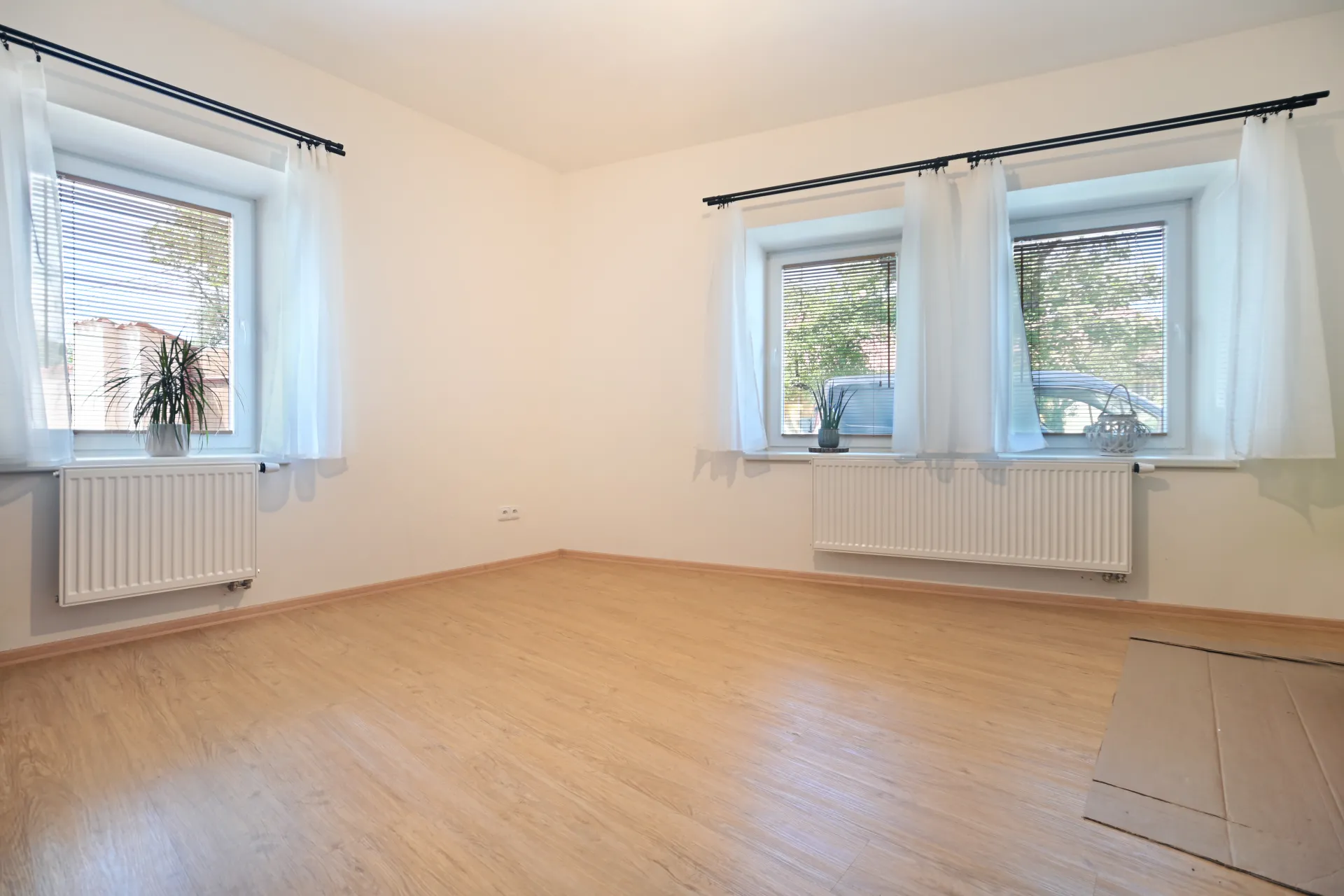 V prvním nadzemním podlaží se nachází obývací pokoj s prostorem pro vkusnou kuchyňskou linku ve tvaru U zn. Gorenje (také z roku 2022). Tato centrální část domu nabízí příjemných 41m2. Z obytné části je možno vstoupit francouzskými okny přímo na zahradu (205m2). Na stejném podlaží se nachází na obou stranách domu dva neprůchozí pokoje, s využitím jako ložnice, pracovna, případně pokoj pro hosty. Ze vstupní chodby můžeme vstoupit také do koupelny osazené jak vanou, tak sprchovým koutem, i prostorem pro pračku se sušičkou. Toaleta je řešena samostatně. Z obývacího pokoje lze vystoupat po dřevěném schodišti do druhého podlaží, kde je situována prostorná ložnice vybavená nábytkem na míru a nabízí i pracovní kout. Na protější straně podlaží je aktuálně dětský pokoj. Uprostřed podlaží je opět toaleta s umyvadlem. V těchto místnostech jsou použita kvalitní střešní okna zn. Velux.