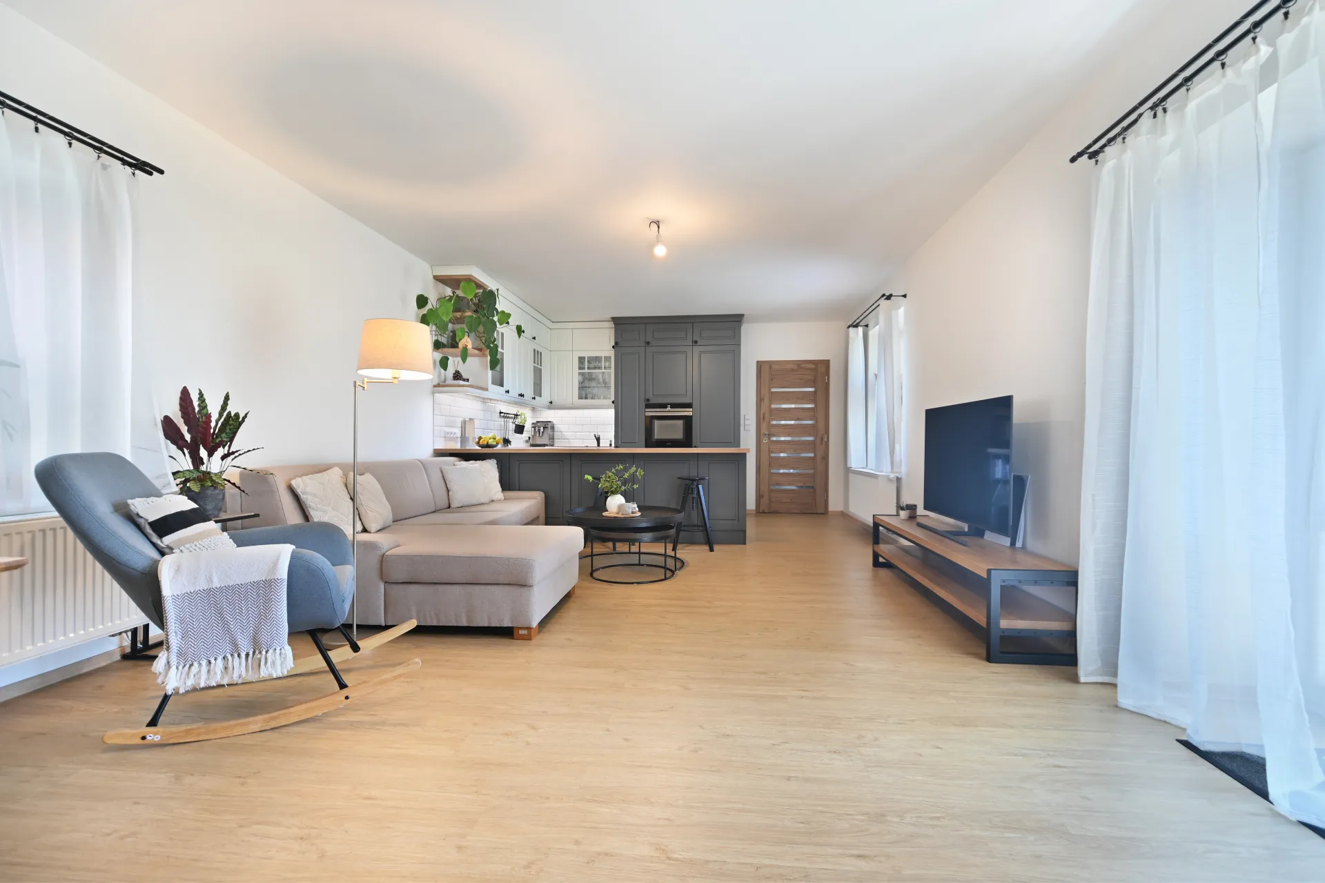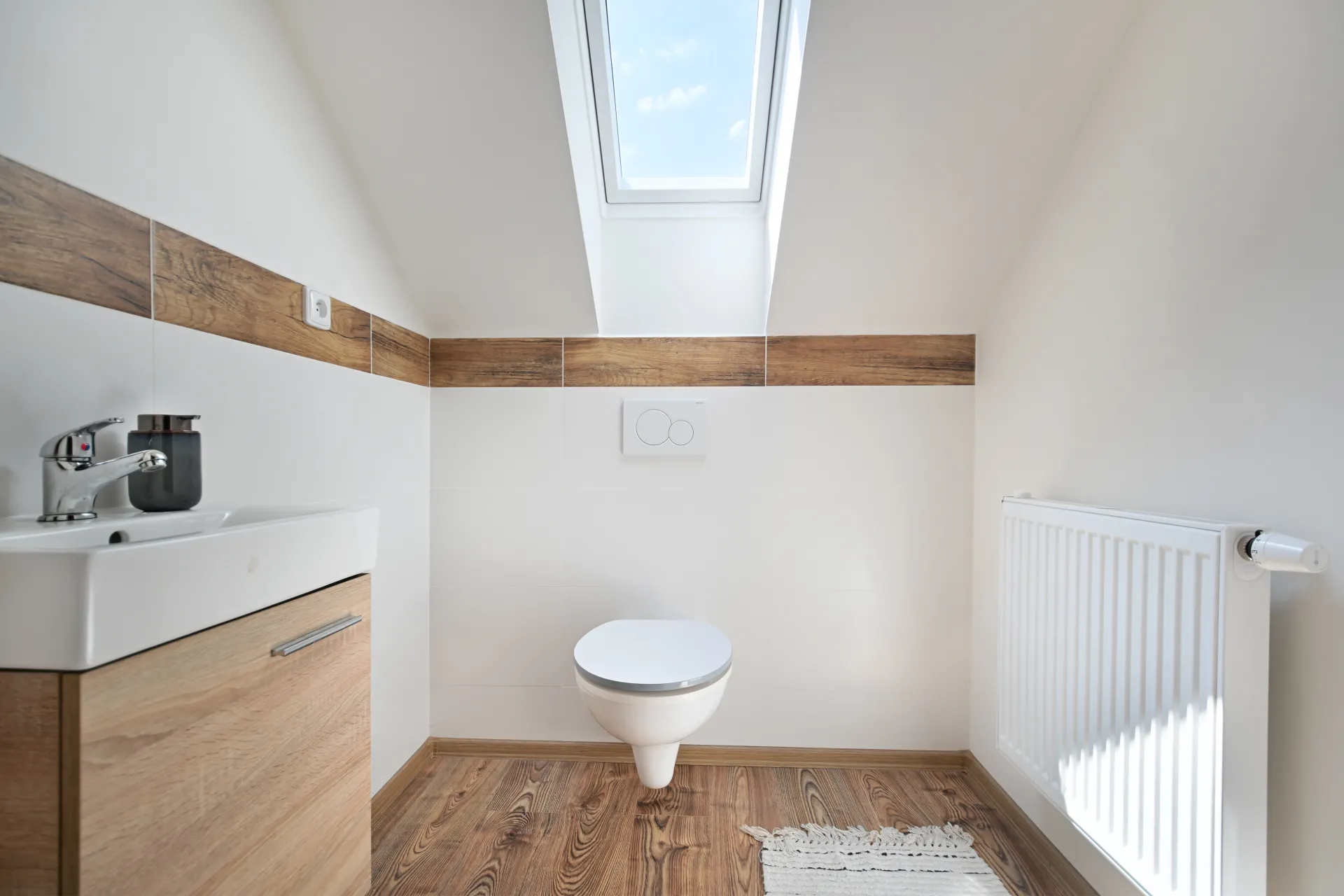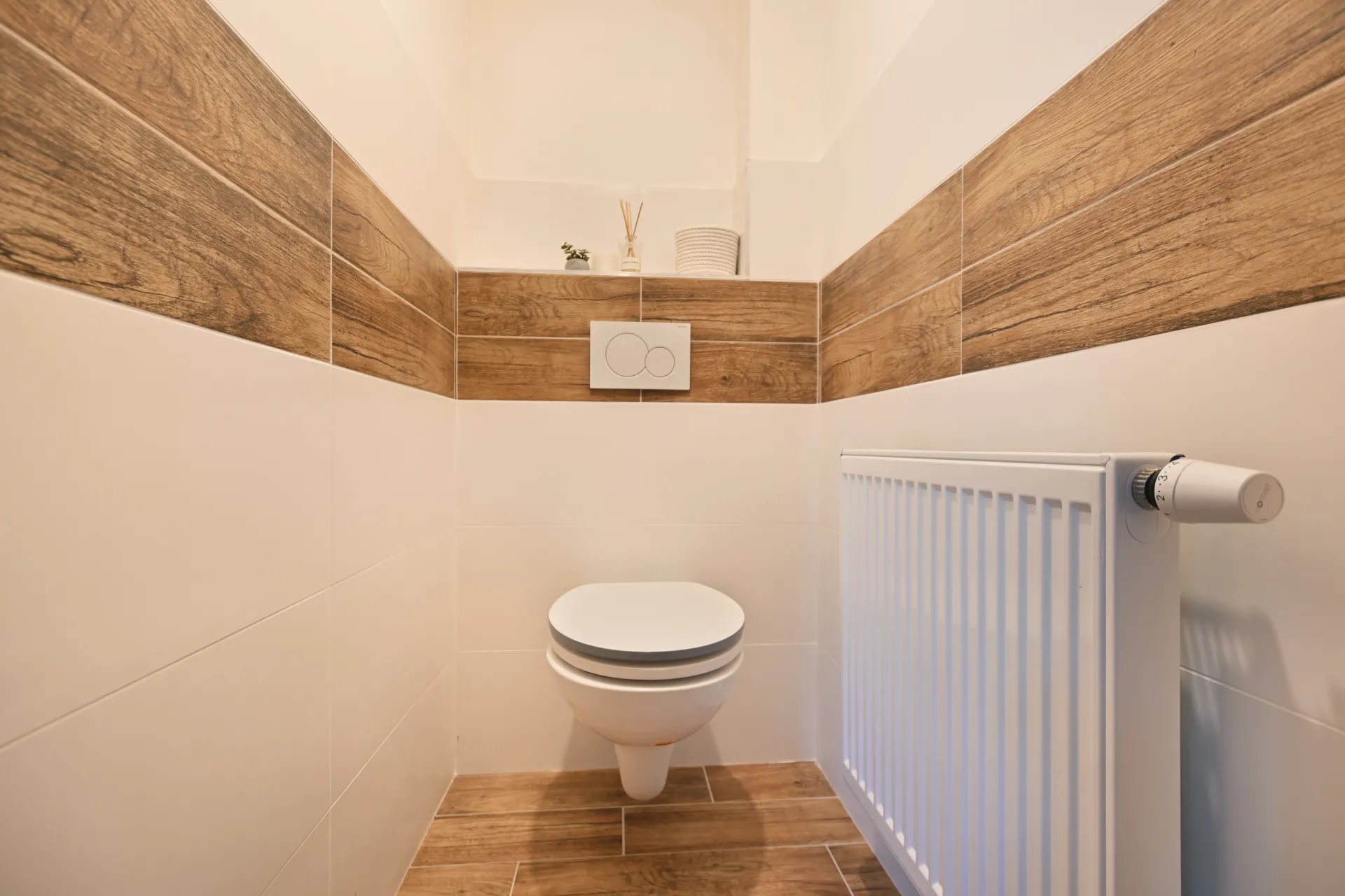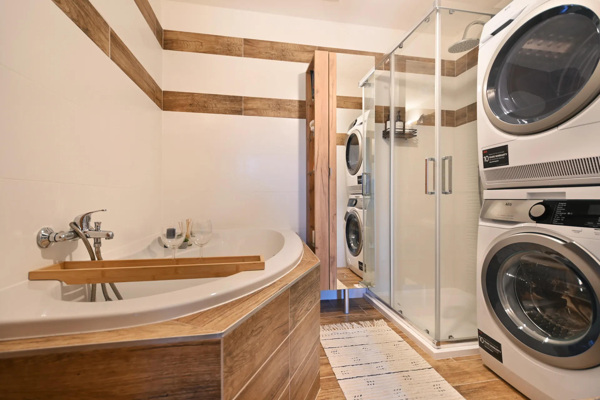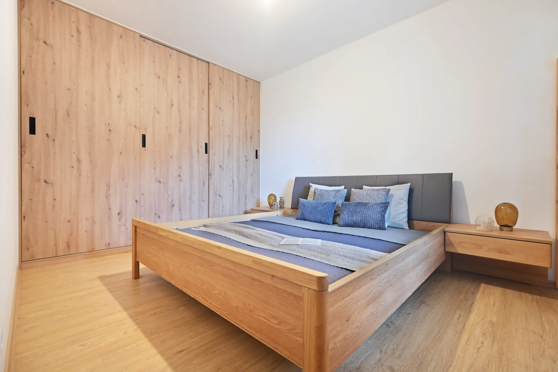 V prvním nadzemním podlaží se nachází obývací pokoj s prostorem pro vkusnou kuchyňskou linku ve tvaru U zn. Gorenje (také z roku 2022). Tato centrální část domu nabízí příjemných 41m2. Z obytné části je možno vstoupit francouzskými okny přímo na zahradu (205m2). Na stejném podlaží se nachází na obou stranách domu dva neprůchozí pokoje, s využitím jako ložnice, pracovna, případně pokoj pro hosty. Ze vstupní chodby můžeme vstoupit také do koupelny osazené jak vanou, tak sprchovým koutem, i prostorem pro pračku se sušičkou. Toaleta je řešena samostatně. Z obývacího pokoje lze vystoupat po dřevěném schodišti do druhého podlaží, kde je situována prostorná ložnice vybavená nábytkem na míru a nabízí i pracovní kout. Na protější straně podlaží je aktuálně dětský pokoj. Uprostřed podlaží je opět toaleta s umyvadlem. V těchto místnostech jsou použita kvalitní střešní okna zn. Velux.