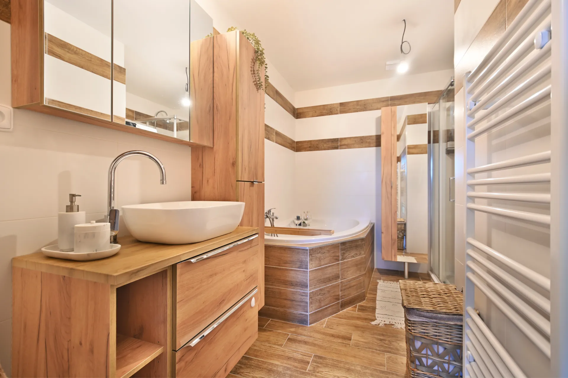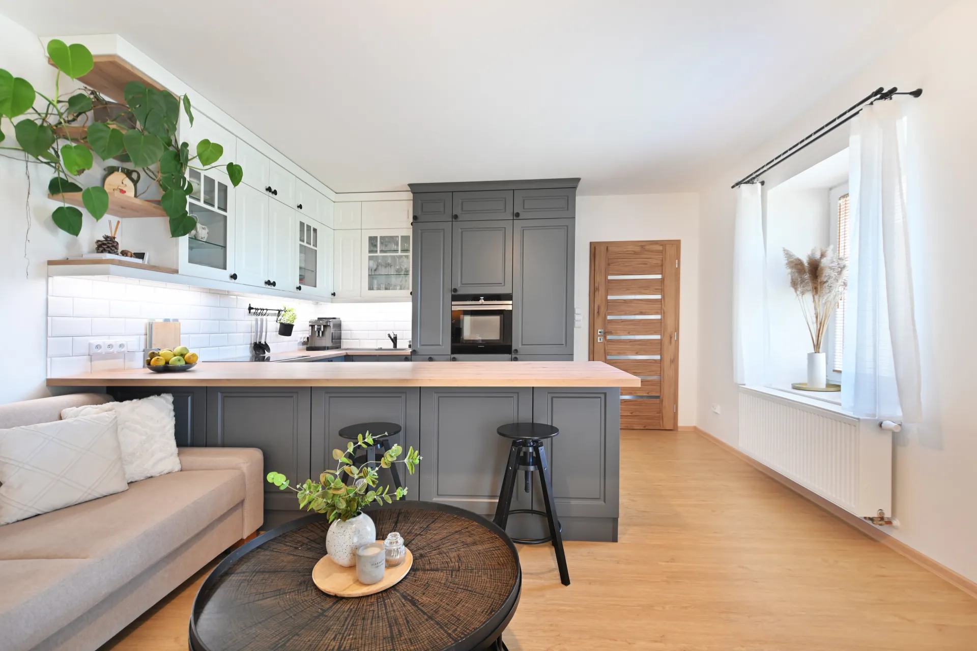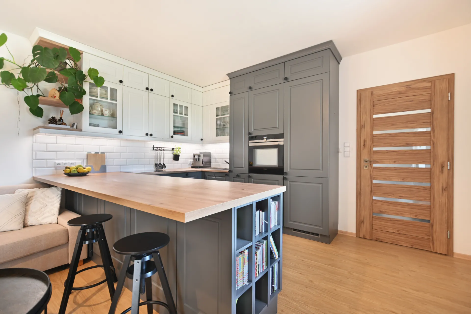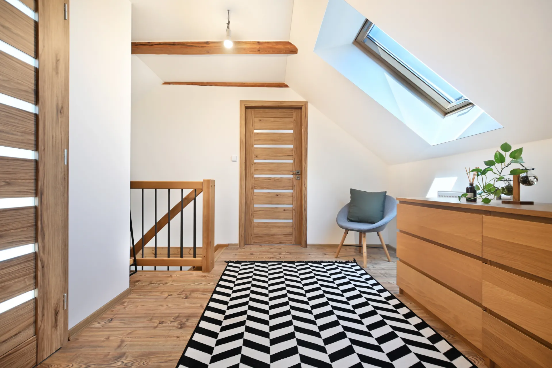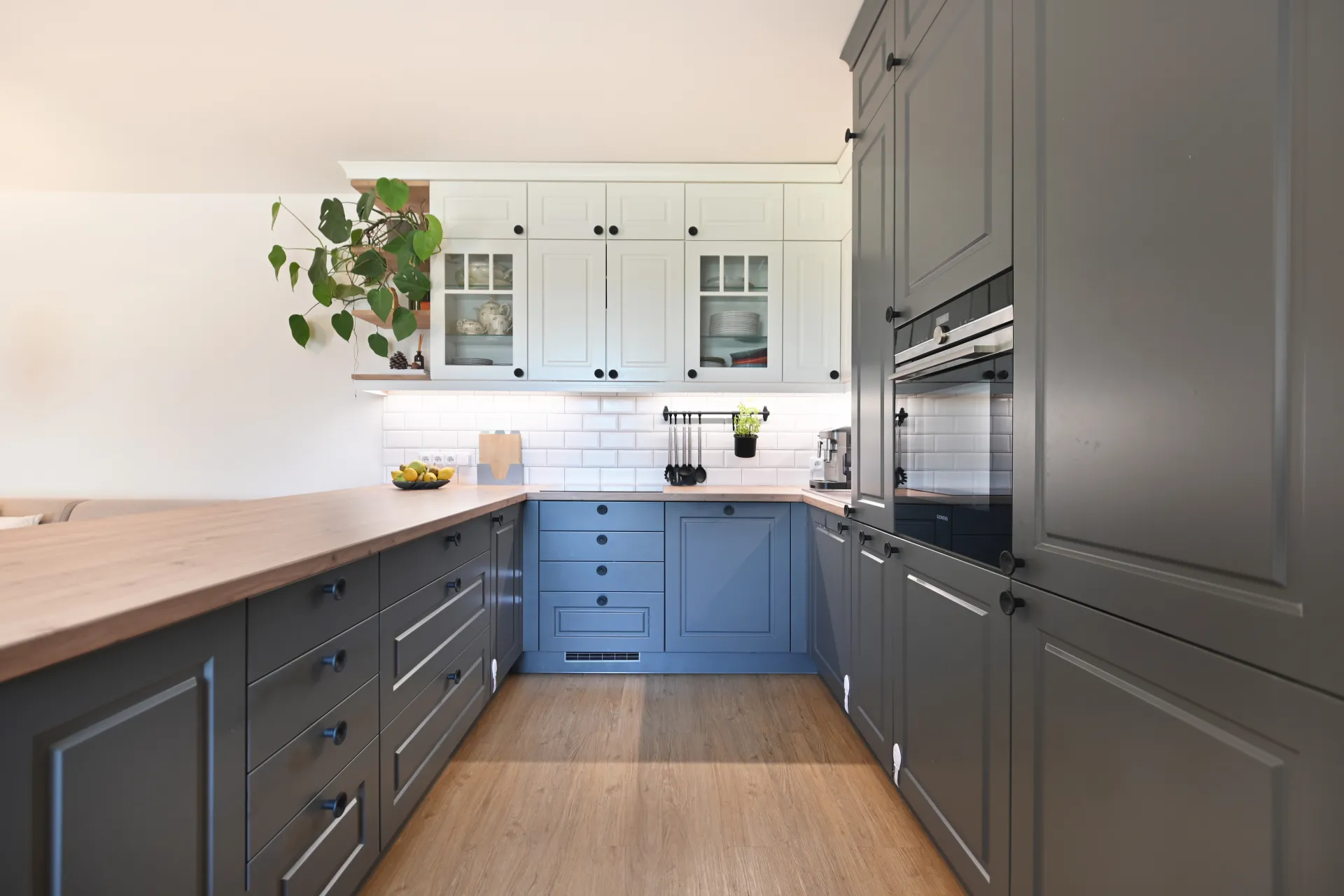 V prvním nadzemním podlaží se nachází obývací pokoj s prostorem pro vkusnou kuchyňskou linku ve tvaru U zn. Gorenje (také z roku 2022). Tato centrální část domu nabízí příjemných 41m2. Z obytné části je možno vstoupit francouzskými okny přímo na zahradu (205m2). Na stejném podlaží se nachází na obou stranách domu dva neprůchozí pokoje, s využitím jako ložnice, pracovna, případně pokoj pro hosty. Ze vstupní chodby můžeme vstoupit také do koupelny osazené jak vanou, tak sprchovým koutem, i prostorem pro pračku se sušičkou. Toaleta je řešena samostatně. Z obývacího pokoje lze vystoupat po dřevěném schodišti do druhého podlaží, kde je situována prostorná ložnice vybavená nábytkem na míru a nabízí i pracovní kout. Na protější straně podlaží je aktuálně dětský pokoj. Uprostřed podlaží je opět toaleta s umyvadlem. V těchto místnostech jsou použita kvalitní střešní okna zn. Velux.