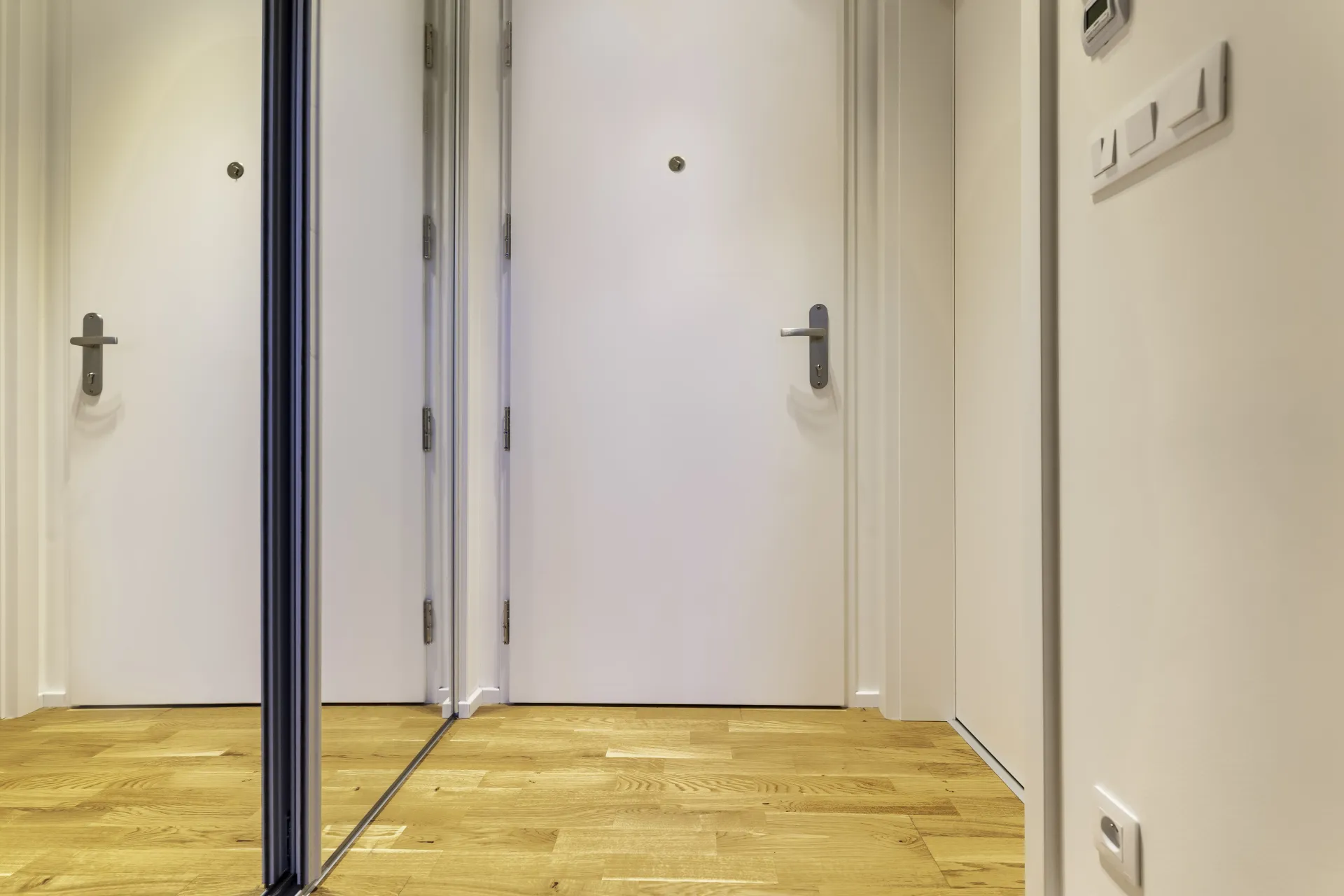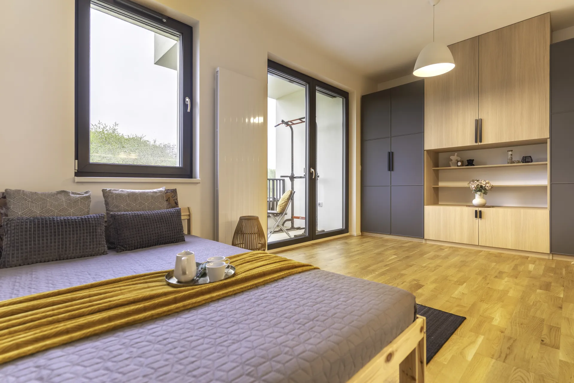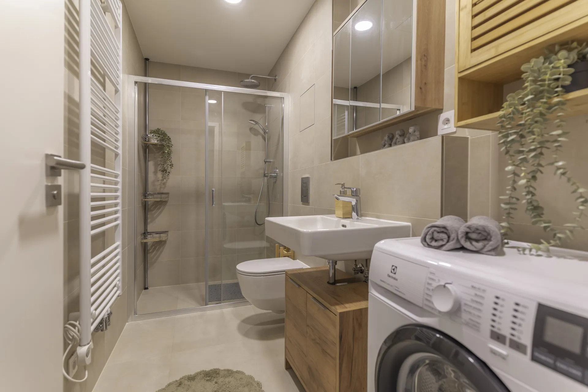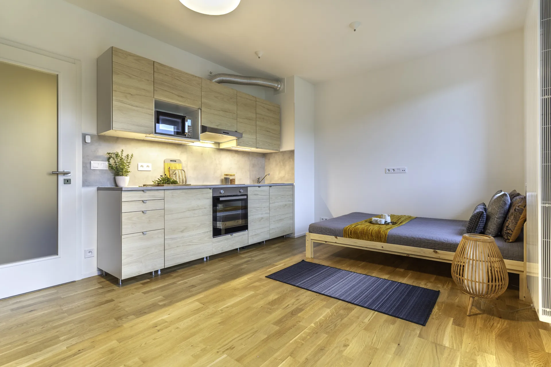 Situován je na severovýchodní stranu, 1. patro (2.NP) s výtahem. Hlavní obytný prostor je vybavený kuchyňskou linkou se spotřebiči (el. varná deska a elektrická trouba, myčka, chladnička a mikrovlnná trouba). Dále úložným prostorem v podobě skříní, a menším dvojlůžkem. V předsíní najdeme další, tentokrát vestavěné skříně a z předsíně můžeme vstoupit do koupelny osazené sprchovým koutem, umyvadlem a toaletou. Je zde i pračka, která je stejně jako ostatní vybavení součástí nabídky.